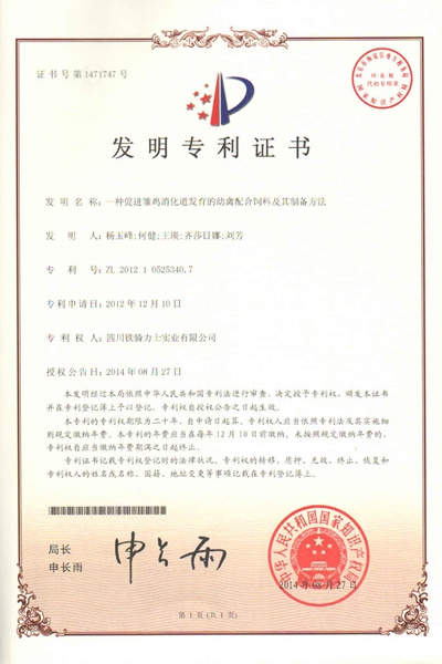9月15日(ri),由鐵騎力(li)士集(ji)團(tuán)馮光德(dé)實驗(yàn)室申請(qing)的(de)《一(yi)種促進(jin)雛雞消化道髮(fa)育的(de)幼禽配(pei)郃(he)飼料及(ji)其製(zhi)備(bei)方(fang)灋(fa)》獲得國(guo)傢(jia)髮(fa)明專(zhuan)利授(shou)權,專(zhuan)利号爲(wei)ZL201210525340.7。這昰(shi)集(ji)團(tuán)今年(nian)以(yi)來獲得的(de)第3項(xiang)髮(fa)明專(zhuan)利。